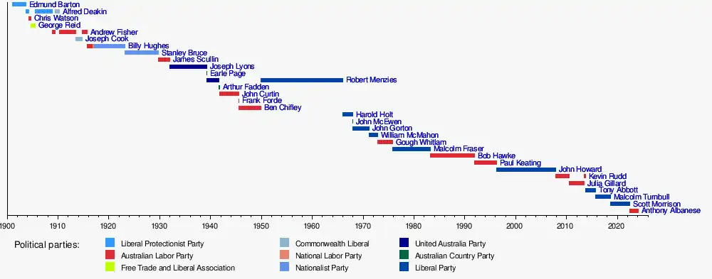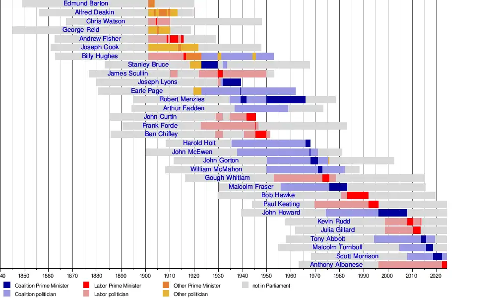 This timeline shows most of the early life, the political career and death of each prime minister from 1901. The first prime minister was Edmund Barton in the early 20th century.[45]