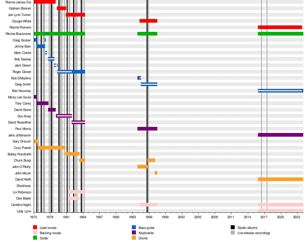 | Lead vocals | Ronnie James Dio | Graham Bonnet | Joe Lynn Turner | Doogie White | |||||||||||||||