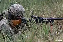 Unidentified riflemen wearing Ratnik equipment and armed with AK-74 rifles at Simferopol Airport in February 2014. The AK-74 carried by the rifleman on the right does not have a magazine inserted.