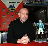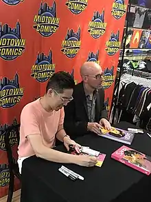 Vaughan (right), at Midtown Comics in Manhattan with artist Cliff Chiang (left). Vaughan is signing different volumes collecting the series, each of which shows Hazel on the covers.
