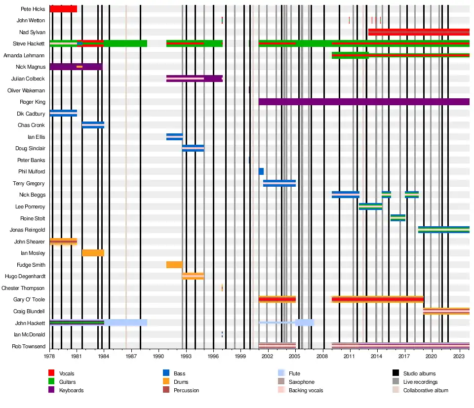 Lee Pomeroy joined in 2012 on bass, variax and 12-string guitar.[18] The line-up changed in 2013 when Lehmann left the band, though she still makes regular guest appearances on tour,[19] and vocalist Nad Sylvan, who had contributed to the Genesis Revisited II album, joined.[20] In 2014 Pomeroy departed and was replaced by a returning Nick Beggs,[21] however he was replaced by Swedish guitarist Roine Stolt in 2015[22][23] who stayed into 2016,[24] he was replaced by Nick Beggs for his third tenure in 2017.[25] Jonas Reingold (a regular collaborator with Stolt) joined the band in 2018 on bass and twelve string.[26] Later in 2018 longtime drummer and vocalist Gary O'Toole departed from the band citing a "horrid year" in his personal life.[27] O'Toole was replaced by Steven Wilson drummer Craig Blundell,[28] this line-up has stayed the same since,[29][30] except when Blundell had commitments with Frost* in 2022 and was covered for by Nick D'Virgilio (Spock's Beard, Big Big Train).[31]