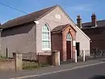 A round-windowed, red and yellow brick building of 1888 replaced the village's first Baptist chapel, first recorded in 1782. |