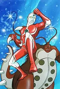 The eponymous Ultraman, Jonias is the strongest warrior of his kind who was dispatched to Earth in the height of unnatural phenomenon that caused monsters to appear.[5] He bonded with SDS member, Chouichirou Hikari, during the youth's return to Earth and had been helping his team in defending Earth from monster attacks.[5] During Badel's invasion on Earth and U-40, Jonias and Hikari lost their lives in the ensuing battle and were carried to his home world for recuperation. The recently healed Jonias bonded with Hikari once more to reverse the tide of the battle, therefore saving both their planets. During the U-40's Fleet's raid on Heller City, Jonias separated with Hikari to join his brethren in space in fighting against Empire of Heller's combat ships. Once his deed was done, he would fuse with the youth in one final time to save the SDS and Amia. Once peace has returned to Earth, Jonias revealed his human form to Hikari as he and Amia stayed on Earth to help repair the damages done from the ensuing war. Months later, the two bid farewell to the SDS but promised to return should Earth's safety be threatened again.