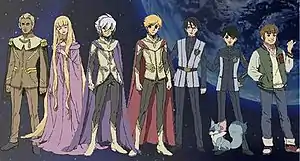 The main cast of the Toward the Terra animated TV series, from left to right: Harley, Physis, Blue, Jomy, Keith, Weeping Mouse, Shiroe, and Sam