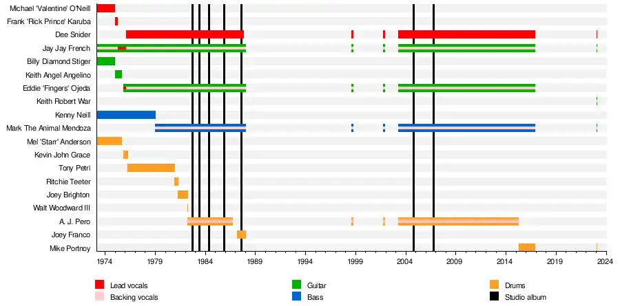 Twisted Sister was an American heavy metal band from Ho-Ho-Kus, New Jersey. Formed in late December 1972 as cover band Silver Star, the group changed its name to Twisted Sister in February 1973 and originally included lead vocalist Michael "Valentine" O'Neill, guitarists Jay Jay French and Billy "Diamond" Stiger, bassist Kenny Neill and drummer Mel "Starr" Anderson.[1][2] The band took a short hiatus in December 1974, after O'Neill instigated a fight with Anderson and threatened to shoot the drummer.[3] They returned early the following year with new vocalist Frank "Rick Prince" Karuba and guitarist Keith "Angel" Angelino (in place of Stiger), although both had left before the end of the year, with French and Angelino's replacement Eddie "Fingers" Ojeda taking over lead vocal duties temporarily before another short hiatus.[4]