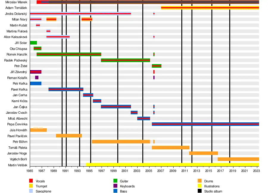 The following is a chronology of the lineups of the Czech progressive rock group Už jsme doma.[1][2] The band has released eleven studio albums, toured worldwide, and strongly influenced the Czech alternative rock scene.[3]