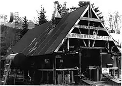 Hunting lodge style Cooper Landing Post Office, built in 1921, photo from 1979. "Beer and Wine" is offered.