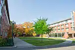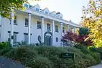 University of Oregon real estate includes buildings in a variety of architectural styles and eras. Many buildings on the main campus were designed by Ellis F. Lawrence, who joined the university in 1914 as campus planner, but by 1915 he had founded the School of Architecture and had become chief architect of the university. Lawrence also held a commission to design all buildings on campus as long as he remained in charge of the School of Architecture. This commission was a source of extra income for Lawrence, and he designed buildings until his death in 1946.[1] Some of the Lawrence buildings are listed on the National Register of Historic Places. Others are not themselves listed but are included in NRHP site surveys. The Memorial Quadrangle, for example, contains buildings listed as contributing resources in the site survey for the Knight Library.[2] These buildings are Condon Hall, Chapman Hall, and the Jordan Schnitzer Museum of Art, although the museum is also separately listed.[3] The Women's Memorial Quadrangle is listed on the NRHP, and it contains three more Lawrence buildings which are contributing resources, Gerlinger Hall, Hendricks Hall, and Susan Campbell Hall.[4]