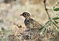 Bustards are large terrestrial birds mainly associated with dry open country and steppes in the Old World. They are omnivorous and nest on the ground. They walk steadily on strong legs and big toes, pecking for food as they go. They have long broad wings with "fingered" wingtips and striking patterns in flight. Many have interesting mating displays.