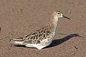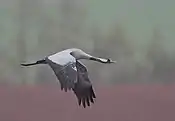 Bustards are large terrestrial birds mainly associated with dry open country and steppes in the Old World. They are omnivorous and nest on the ground. They walk steadily on strong legs and big toes, pecking for food as they go. They have long broad wings with "fingered" wingtips and striking patterns in flight. Many have interesting mating displays.