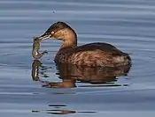Grebes are small to medium-large freshwater diving birds. They have lobed toes and are excellent swimmers and divers. However, they have their feet placed far back on the body, making them quite ungainly on land.