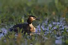 Grebes are small to medium-large freshwater diving birds. They have lobed toes and are excellent swimmers and divers. However, they have their feet placed far back on the body, making them quite ungainly on land.
