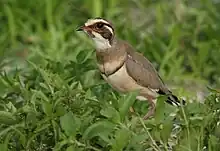 Bustards are large terrestrial birds mainly associated with dry open country and steppes in the Old World. They are omnivorous and nest on the ground. They walk steadily on strong legs and big toes, pecking for food as they go. They have long broad wings with "fingered" wingtips and striking patterns in flight. Many have interesting mating displays.