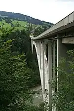| 43 | Großdorf Bridge | Großdorfer Brücke | 358 m (1,175 ft) | Box girder Prestressed concrete | Road bridge | 1982 | Lingenau–Egg 47°26′32.5″N 9°55′22.5″E / 47.442361°N 9.922917°E | Vorarlberg | [S 49] | ||