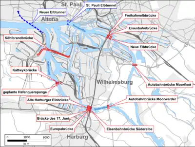 | Brücke des 17. Juni | 1937 (1949) | 472 m (1,549 ft) | Harburg, Wilhelmsburg | originally named Wilhelmsburger Brücke, renamed after the 1953 uprising in East Germany | ||