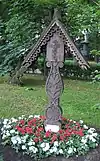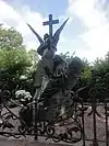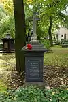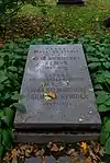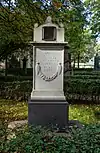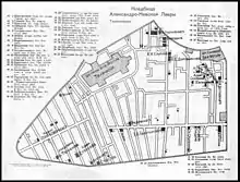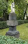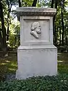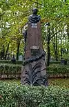 During the early Soviet period a number of monuments were stolen or destroyed. The cemetery was officially closed for burials in 1927, though they continued until 1932, and it was decided to turn it into a necropolis museum, displaying historically and artistically significant graves.[2][1] Alongside this was concept of gathering together the graves of the friends and contemporaries of Alexander Pushkin for the 1937 centenary commemorations of the poet's death. The architectural and planning department of Lensovet, the city administration, was tasked with creating a memorial park project.[2] Plans were drawn up by architects E.N. Sandler and E.K. Reimers, with further input from the city's chief architect L.A. Ilyin.[2] The Funeral Affair Trust was established to run the necropolis museum, including removing abandoned gravestones for sale as building materials.[4] The reconstruction radically altered the nature and appearance of the Tikhvin cemetery. With the intention being to create an "artists' necropolis", graves of those from other sections of society were removed. Fewer than a hundred of the original monuments were preserved.[2] Meanwhile, the remains of prominent artists, sculptors, composers and musicians were reburied in the cemetery. Among them were personal friends of Pushkin, including Konstantin Danzas, Anton Delvig, and Fyodor Matyushkin.[2]