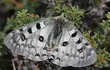 The Apollos, genus Parnassius are high altitude palearctic butterflies that are different in appearance from other swallowtails, being of moderate size, with white ground colour, and spotted with red, black and blue.