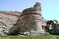 | Kovachevsko kale castrum | ![]() | Kovachevsko kale is a late Roman fortress, whose ruins are located 6 km west of the town of Popovo, near the modern road Popovo - Byala. The ancient name of the settlement is unknown. The Czech archaeologist Karel Škorpil called it Kovachoveshko kale, after the name of the nearby village, Kovachevets. The fortress is located on a flat terrain, naturally protected by low-water rivers. It has a roughly triangular form. The defensive stone walls are fortified with 17 U-shaped towers. There are two gates, one to the west, to other one to the north-east. | ![]() |