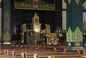 Apart from Art Deco as a form of modernism, there were also attempts by many Dutch architect to modernize the indigenous architecture by creating a synthesized form of architecture which combined Western architecture with indigenous Indonesian elements.[12] In 1936, Henri Maclaine Pont designed the Pohsarang Church in Kediri, which incorporated Hindu-Buddhist elements into a Western building.[12] This legacy lived on even after the independence of Indonesia, and was applied to various public buildings, including churches in the country. In 1972, native Balinese I Wayan Mastra became head of the Balinese Protestant church, and began a process of Balinization. When Blimbingsari church, a basic stone and wood building, was destroyed by earthquake in 1976, it was rebuilt in more Balinese pendopo style, with a garden with running water, traditional Balinese entrance and a semi-open aspect. A similar trend occurred in other islands, such as Batak Karo architecture of St. Francis Asisi's Church in Berastagi, and the Ganjuran Church, which used Javanese Joglo architecture.