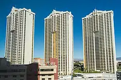 Development of the property began in 1972.[63] Sales were initially sluggish, and most of the units were used as short-term rentals for several years.[63] In 1977, the developers began converting units into timeshares.[63] The timeshare program initially included 85 units,[64] and later expanded to include most of the building.[65] A second phase of construction was originally planned to add a third tower with 650 units on 30 floors, as well as a casino, restaurants, and showrooms.[62][66] The casino was built in 1981, but never opened;[67] instead, the developer went into bankruptcy, and the land was sold off.[68][69]