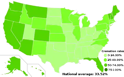 The cremation rate in the United States has been increasing steadily, with the national average rate rising from 3.56% in 1960 to 53.1% in 2018. Projections from the Cremation Association of North America forecast a rate of 59.4% in 2023.[28][29] The rates vary considerably among the states with the highest rates (over 70%) being reported in the Western United States with the lowest rates (under 30%) being reported in the Southern United States.[30]