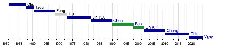 The magistrate of Hsinchu County is the chief executive of the government of Hsinchu County. This list includes directly elected magistrates of the county. The incumbent Magistrate is Yang Wen-ke of Kuomintang since 25 December 2018.