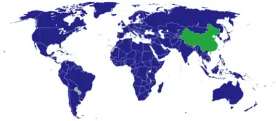 This is a list of diplomatic missions in the People's Republic of China, excluding Hong Kong and Macau. Due to the One-China policy, the PRC is recognized by 179 out of 193 United Nations member states and the State of Palestine as its sovereignty is disputed by the Republic of China. As the world's most populous country, the world's largest economy by PPP, and a major great power, as well as an emerging superpower,[1][2] China is a permanent member of the United Nations Security Council, with a recognized nuclear power state and the world's largest standing army. In 2019, China had the largest diplomatic network in the world.[3] China hosts a large diplomatic community in its capital city of Beijing. Beijing hosts 175 embassies,[4] with numerous countries maintaining consulates general and consulates throughout the country.