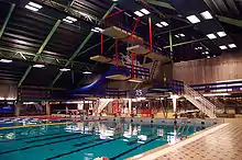 This is a list of diving facilities, especially those including 10-meter diving platforms. This is usually the last feature of an athletics complex required for training and competition in the full program of Olympic swimming and diving. In the United States, a 10-meter platform is required for full NCAA competition,[1] although two schools may hold a dual NCAA meet at a facility lacking one if both schools agree. Organizations that set standards for diving facilities include FINA which governs international competitions, and, in the United States, NFHS, NCAA, and USA Swimming. A typical requirement for indoor facilities is that they must provide 5 metres (16 ft) clearance above the highest diving board or platform, so that divers do not hit a ceiling structure.[1]