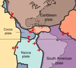 Earthquakes are relatively frequent occurrences in Guatemala.[1] The country lies in a major fault zone known as the Motagua and Chixoy-Polochic fault complex, which cuts across Guatemala and forms the tectonic boundary between the Caribbean Plate and the North American Plate. In addition, along Guatemala's western coast line, the Cocos plate pushes against the Caribbean Plate, forming a subduction zone known as the Middle America Trench located approximately 50 km off Guatemala's Pacific coast. This subduction zone led to the formation of the Central America Volcanic Arc, and is an important source of offshore earthquakes.[2] Both these major tectonic processes have generated deformations within the Caribbean plate and produced secondary fault zones, like the Mixco, Jalpatagua, and Santa Catarina Pinula faults.[3]