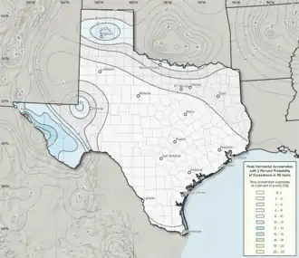 Map of seismic hazard in Texas as of 2014, as determined using the peak ground acceleration with 2% probability of exceedance in 50 years