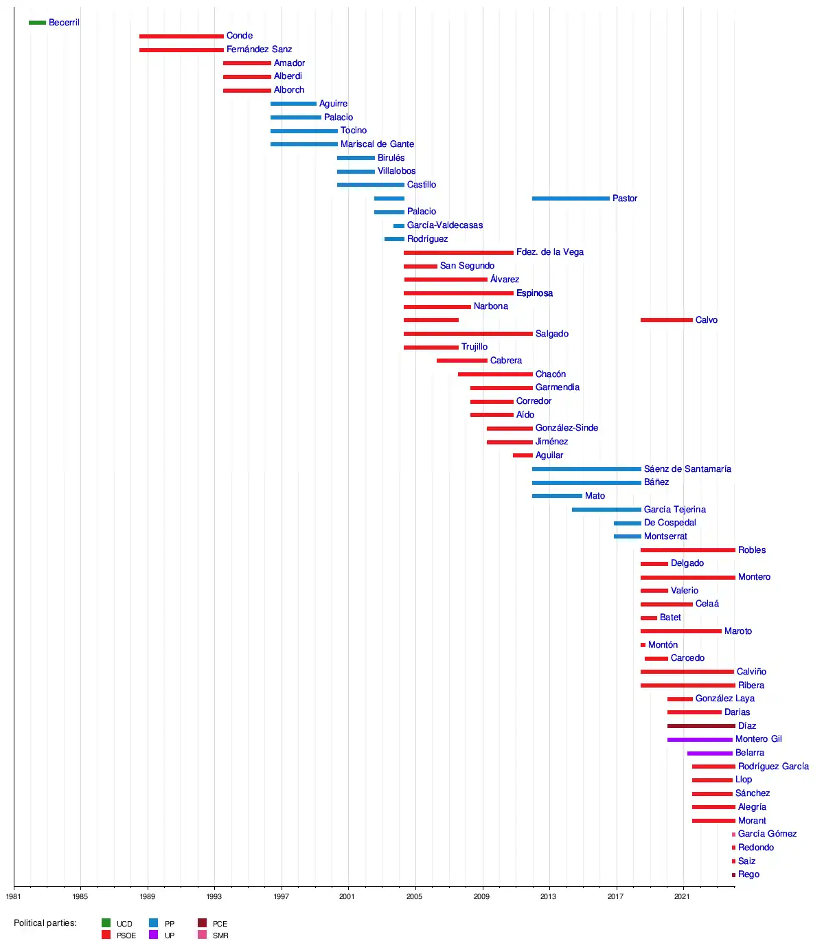 Ana Redondo | Ministry of Equality | 21 November 2023 | Incumbent | PSOE | Pedro Sánchez | ||