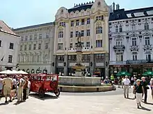 This is a list of fountains, drinking fountains and water wells in Bratislava, the capital of Slovakia. Approximately half of the over 140[1] fountains found in the city form part of the picturesque landscape of the medieval Old Town of Bratislava (the city was known in the past under many names) and serve as tourist attractions while many of the newer fountains are fine examples of socialist era building of modern panelák city suburbs. The number of fountains in Bratislava is comparable to the four times larger neighboring Austrian capital Vienna.[2]
