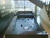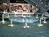Not functional, the fountain is uninstalled from its basin. It used to contain spheres made of stainless steel and chrome and it was designed together with the huge lamp above the fountain. | |