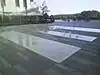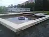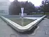 The main, outside part of the system of fountains that includes one long but narrow pool that actually runs through the main entrance hall and continues on the outside, it was constructed by Slovak company Mramor Ltd.. It is made of steel and tiles. |