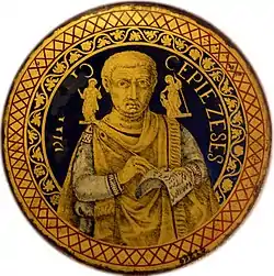 The portrait medallion is a part of the ornamentation of the so-called Desiderius Cross, 9th-century processional crux gemmata currently preserved in Museo di Santa Giulia, Brescia, Italy.[1]