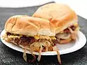 | Slider | ![]() | According to the earliest citations, the name originated aboard U.S. Navy ships, due to the way greasy burgers slid across the galley grill while the ship pitched and rolled.[38][39] Other versions claim the term "slider" originated from the hamburgers served by flight line galleys at military airfields, which were so greasy they slid right through one; or because their small size allows them to "slide" right down the throat in one or two bites. White Castle trademarked the spelling variant "Slyder" and used it between 1985 and 2009.[40] | Primarily refers to small hamburgers, but can also cover any small sandwich served on a slider roll |