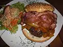 | Bacon cheeseburger | ![]() | An A&W Restaurants store in Lansing, Michigan in 1963 | Hamburger with bacon and cheese is a bacon cheeseburger, which became an official menu item at an A&W Restaurant owned by Dale Mulder in Lansing, Michigan, in 1963.[6][7] Hamburgers with bacon but no cheese may be referred to as bacon burgers. |