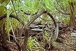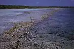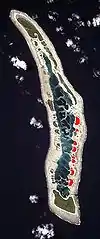760,000 m2 | Long Islet lies along the windward side of Caroline Atoll, extending over 4.2 km by only about 300 m wide. Once five distinct islets that have since fused together, Long has a complex geological history, with some areas (previous inlets) still devoid of vegetation from beach to lagoon. It therefore also possesses the greatest diversity of vegetation amongst the islets of Caroline Atoll. Mature Tournefortia and Pisonia groves grow on the sites of the former islets, with scattered Cocos and Cordia In 1990, a small marae was discovered at the islet's southern end. | ![]() Narrow channel between Long and Nake Islets. | |