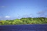 | Shark Islet | 80,000 m2 | Named for another shark encounter during the 1988 survey, this time along the beach, Shark Islet possesses Caroline's most notable sandy beach on its lagoon shore. Vegetation exists in concentric rings, rising to a Pisonia forest that covers about half the islet and provides abundant nesting venues for great frigatebirds and black noddies. | ![]() Shark Islet seen across the Caroline Island lagoon. | |