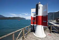 Río Negro. | 41°58.2′S 72°28.5′W / 41.9700°S 72.4750°W | Fl.W. period 10s fl. 0.5s, ec. 9.5s | 23 7 9 | White fiberglass tower, red bands; | 13. | Visible 280°-090°. |