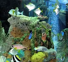 | Royal angelfish | ![]() | Pygoplites diacanthus | No | Orange and blue striped with dark blue dorsal fin and lemon yellow caudal fin. | 25 cm (9.8 in)[17] |