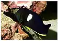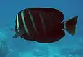 | French angelfish | ![]() | Pomacanthus paru | No | Juveniles are black with 3 yellow vertically running stripes, may also display blue on pelvic fins. Adults lard black with white vertical stripes. | 41 cm (16.1 in)[10] |