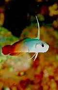 | Orangehead anthias | Pseudanthias heemstrai | Yes | Pink underside with orange back and mask, dark red splotch on caudal fin, along with iridescent blue anal and pelvic fins. | 13 cm (5.1 in) | |