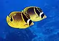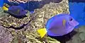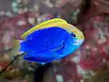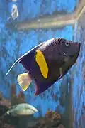 | Majestic angelfish or blue girdled angelfish | ![]() | Pomacanthus navarchus | No | Yellow dorsal and caudal fins connecting to "saddal" with dark blue dots. Dark blue underside and anal fin. Electric blue separating yellow and dark blue. | 30 cm (11.8 in)[14] |