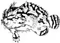 | Blue line grouper | ![]() | Cephalopholis formosa | No | Dark tan with horizontal blue stripes that are not particularly straight. The caudal fin has more of these stripes, and they radiate from the base of the fin out to the tips. | 34 cm (13.4 in) |