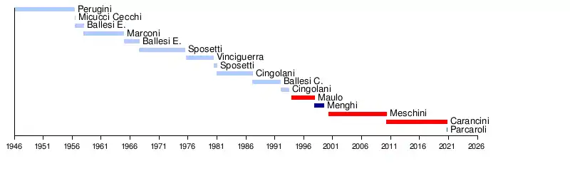 | 1 | Otello Perugini | 20 April 1946 | 26 May 1956 | Christian Democracy |