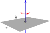 | Tilted solid cuboid of depth d, width w, and length l, and mass m, rotating about the vertical axis (axis y as seen in figure).