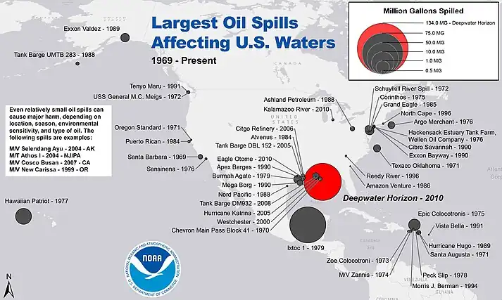 300. "Case Study Example for Oil Spill Movement and Fate – Notable oil spills". University of Alabama – College of Engineering. 23 October 2002. Archived from the original on 4 March 2016. Retrieved 15 January 2015.