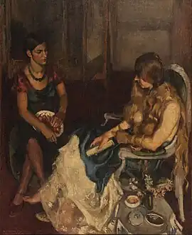 In her early years, Sher-Gil worked at the École des Beaux-Arts, Paris, and won awards at the annual competitions for portrait and still life for three years in a row.[5] In the summer of 1932, Sher-Gil submitted six paintings to the "end of year concours", Paris, for which she received second mention in her capacity as foreigner.[6] The six included Violins, Nude Self-Portrait with Palette, and Young Girls.[6] In her words, "my work in those days was absolutely Western in conception and execution except for the fact that it was never entirely tame or conventional".[5]
