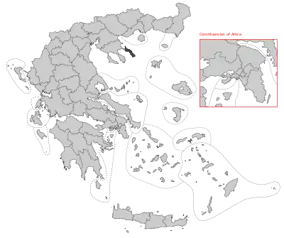 This is a list of electoral constituencies returning Members of Parliament to the Parliament of Greece. The list reflects the changes which were made to Athens B and Attica in December 2018.[1] Electoral constituencies account for 285 of the 300 parliamentary seats,[2] while the other 15 are elected on a national level through party-list proportional representation. Each constituency, with the exception of those in Attica and Thessaloniki, corresponds to a single prefecture of Greece, even though these were abolished in 2010.